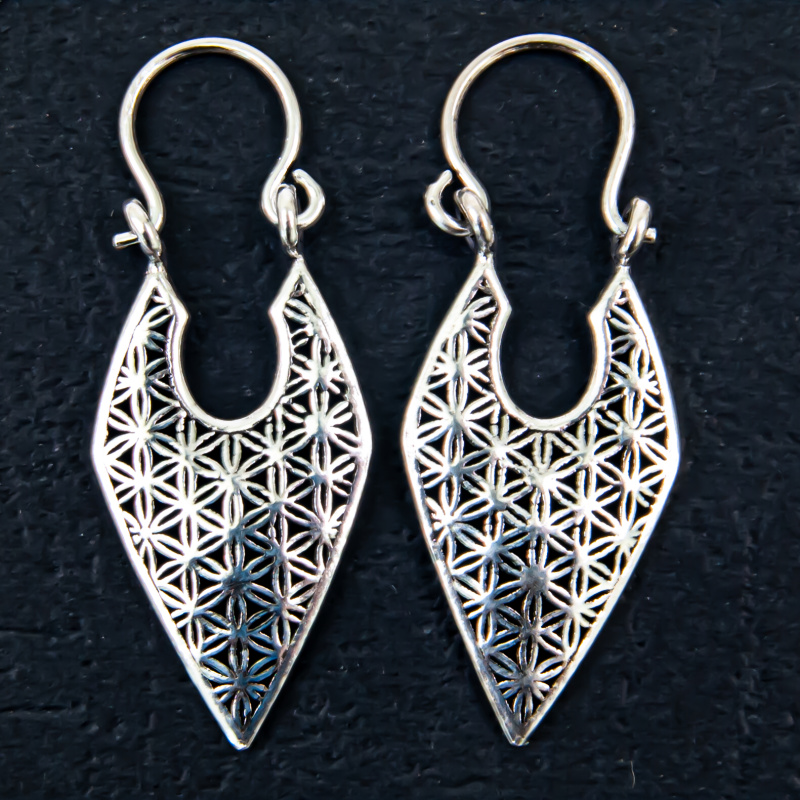 Striking dangling silver earrings with atypical clasp and flower of life design motif.