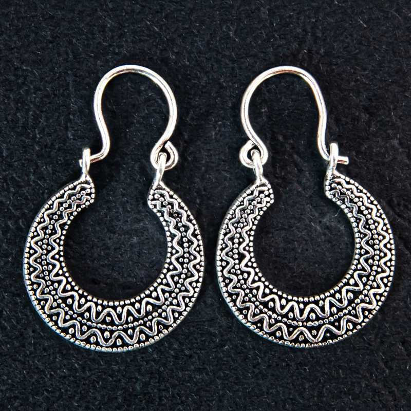 Interesting silver earrings with atypical clasp, decorated with zigzag lines, reminiscent of the drawing of a snake's back.