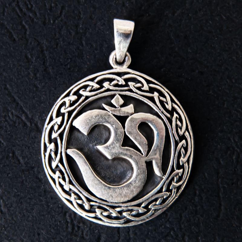 Silver pendant in the shape of a medallion decorated with an interlaced circle and the syllable Om.
