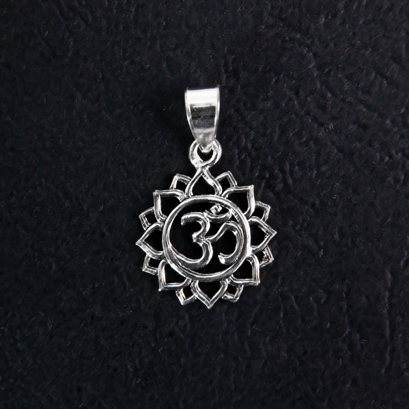 Elegant silver pendant with the syllable Om placed inside a lotus flower.