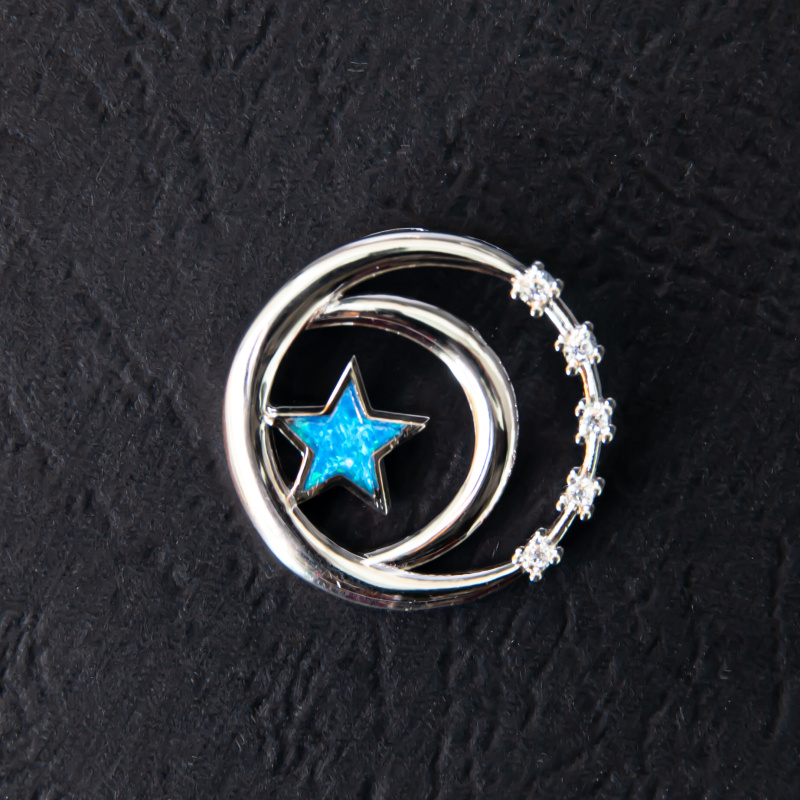 Silver star-shaped pendant, decorated with synthetic opal and rhinestones.