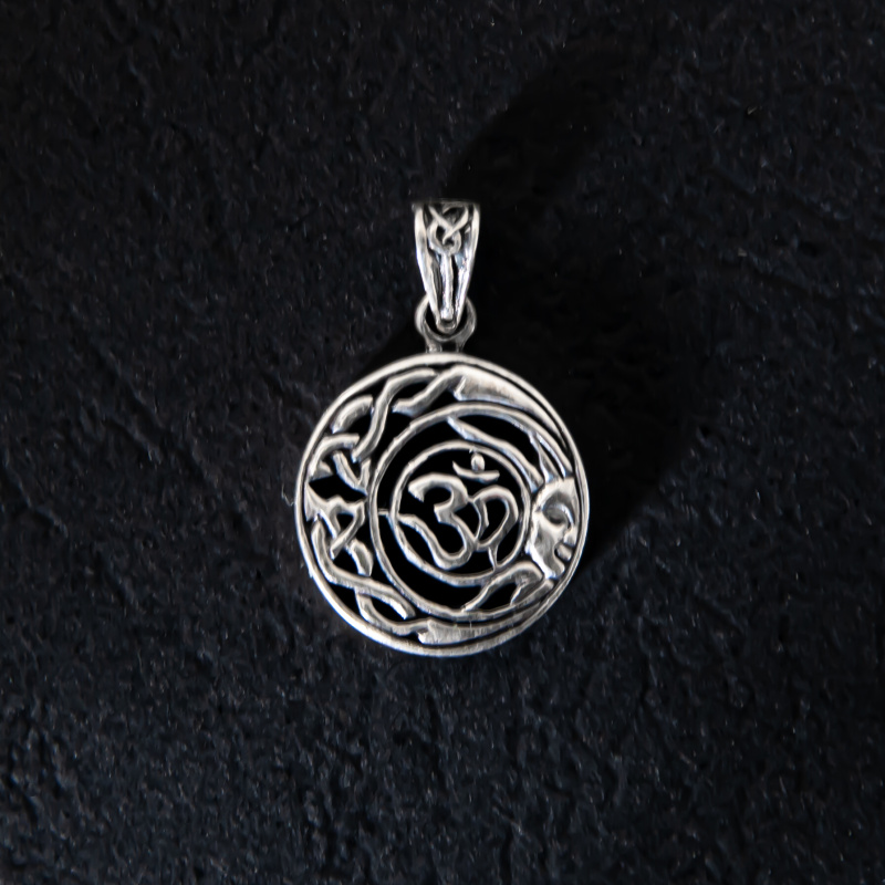Elegant silver pendant with the syllable Om in the embrace of the sun and moon.