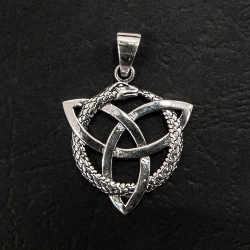 Silver pendant in the shape of a Triquerty, intersected by the Uroboros symbol.