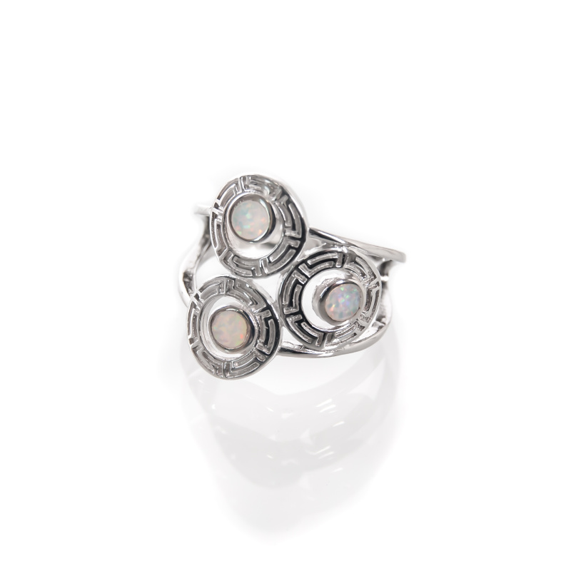 Elegant silver ring with three round brooches, inlaid with synthetic white opal.