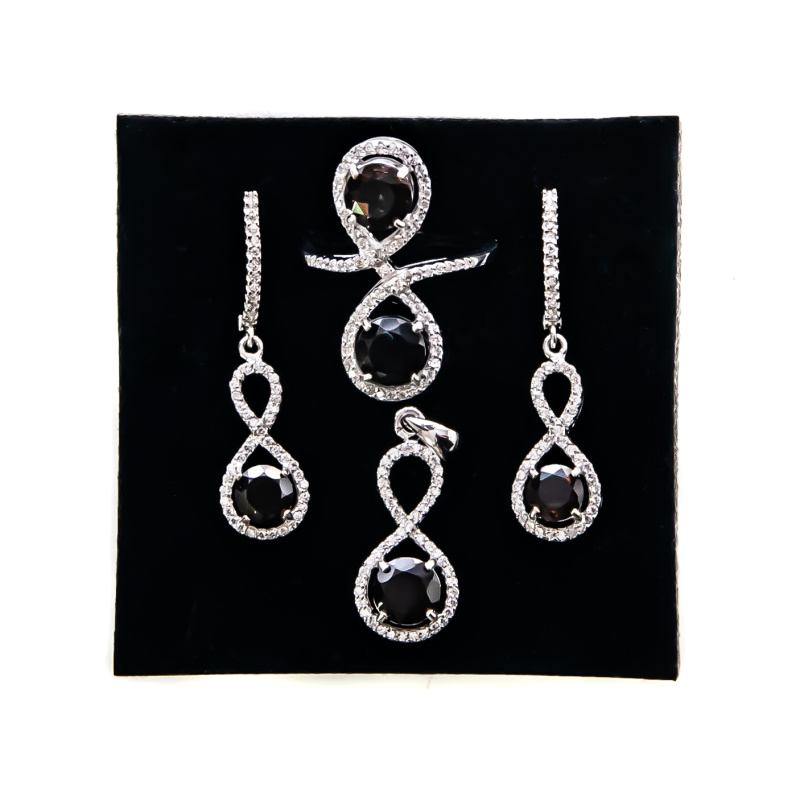 Ring, pendant and earrings set in the shape of an eight, decorated with brown synthetic stones and rhinestones.