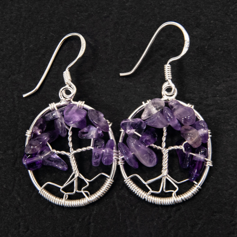 Product description Silver Wire Earrings Tree of Life Amethyst