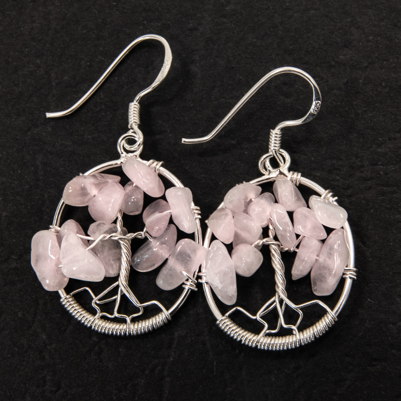 Product description Silver Wire Earrings Tree of Life Rose Quartz