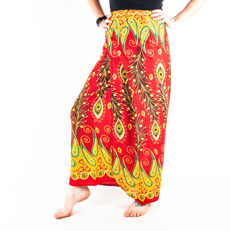 Cotton skirt Peacock Feathers in red with multiple tie options