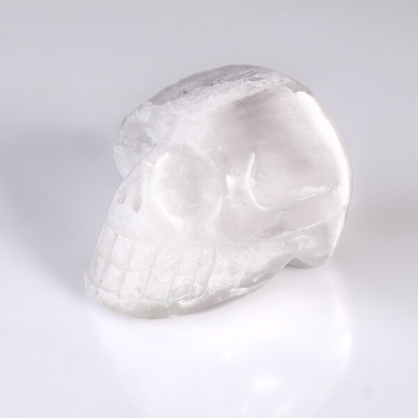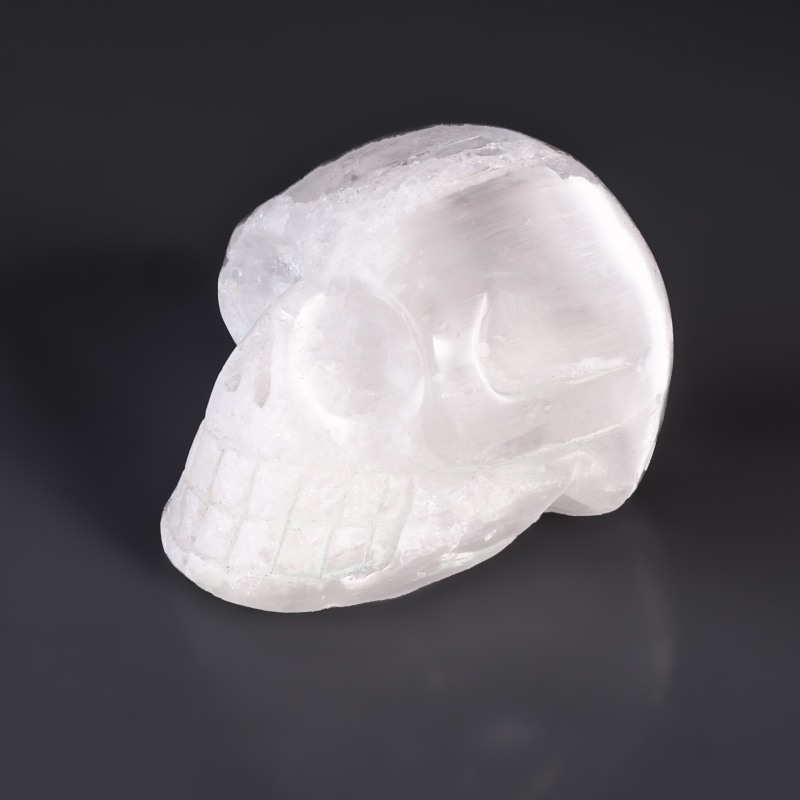Selenite skull. Selenite is a translucent form of gypsum that gets its name from its pearly appearance. It is the "moon-like" lustre that links the stone to the Greek goddess Selene, the mistress of the moon.
