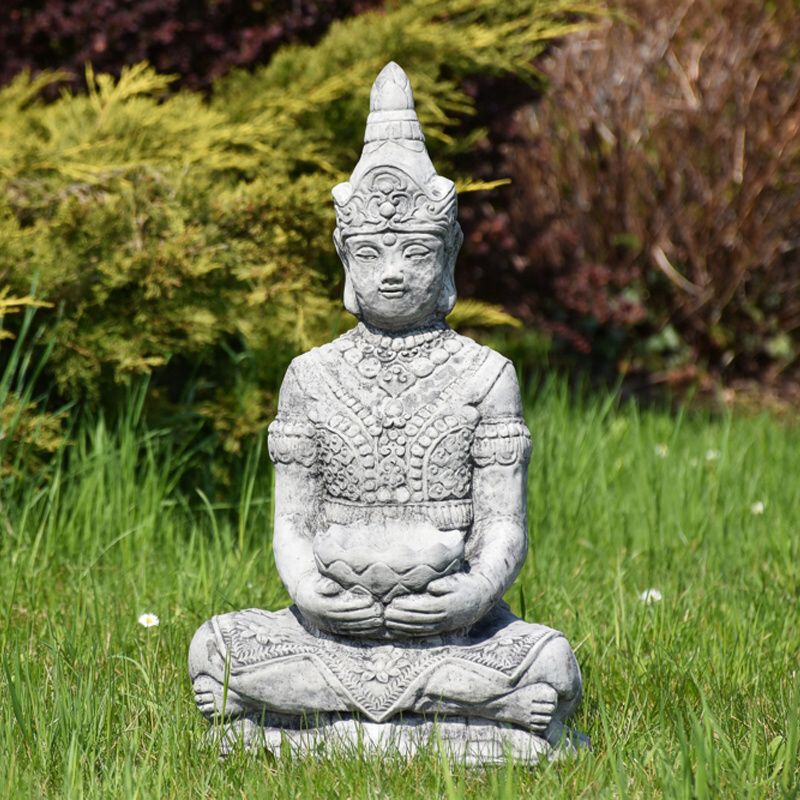 The statue depicting the enlightened Buddha is made of concrete, which makes it able to withstand frost and weather conditions, and is ideal for outdoor spaces. Placed on a balcony, patio or garden, facing the door, the Buddha will bring beneficial energy into your home, according to feng-shui principles.