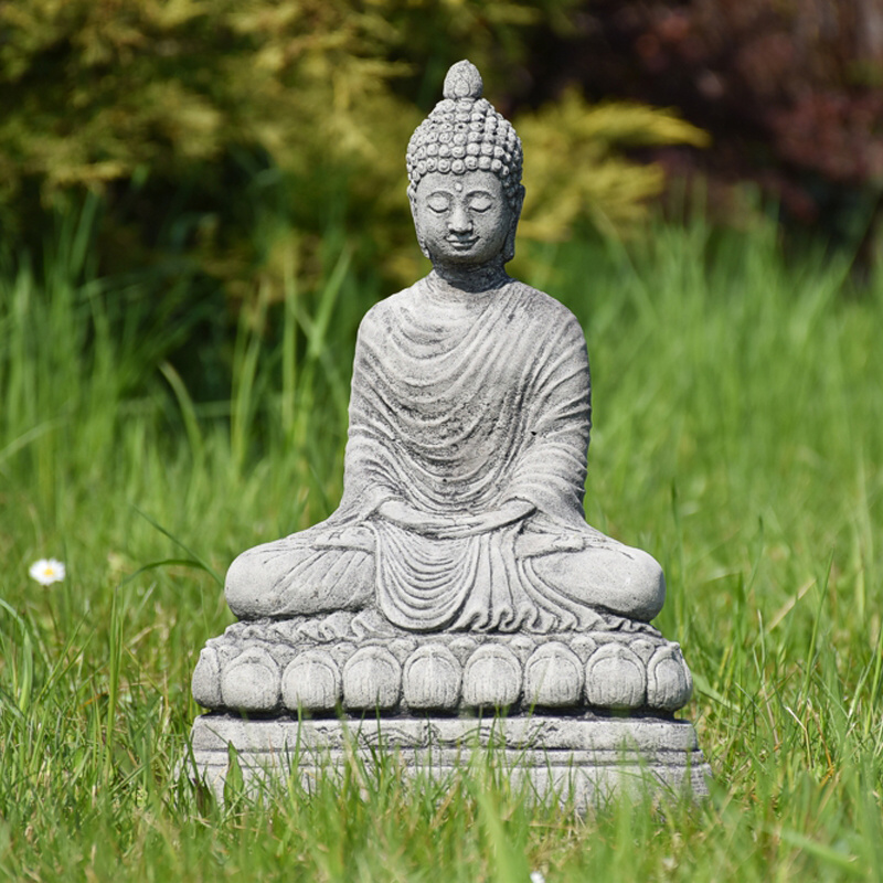 The statue depicting the enlightened Buddha is made of concrete, which makes it able to withstand frost and weather conditions, and is ideal for outdoor spaces. Placed on a balcony, patio or garden, facing the door, the Buddha will bring beneficial energy into your home, according to feng-shui principles.