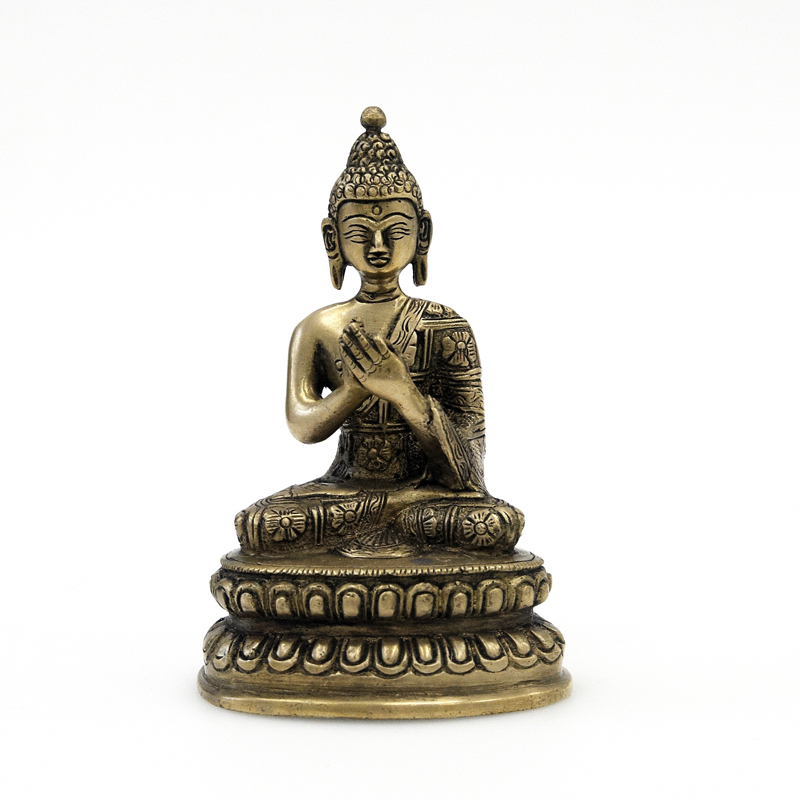 The Buddha is often depicted with a shaved head or short-cropped hair, sometimes with a crown. His colour is golden.