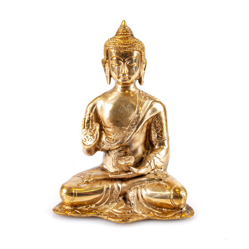 Buddha is usually depicted with a shaved head or short-cropped hair, sometimes with a crown. His colour is golden.