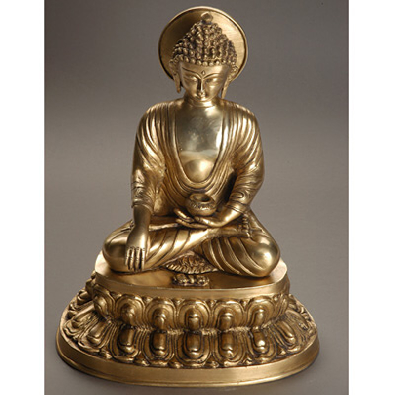 The Buddha is often depicted with a shaved head or short-cropped hair, sometimes with a crown. His colour is golden.