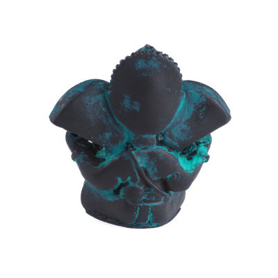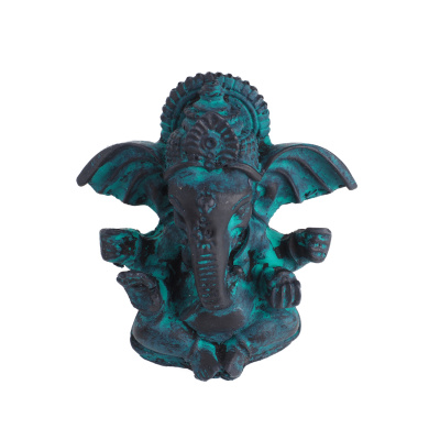 The statue depicts a seated Ganesha. It is cast in resin and has a patina created by green paint. Resin is a mixture of polyester resin and floating chalk. Resin products are very precisely crafted with attention to every detail.