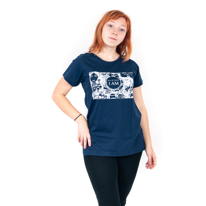 Women's T-shirt with print and positive mantra I AM ALL OF THAT in blue, size M