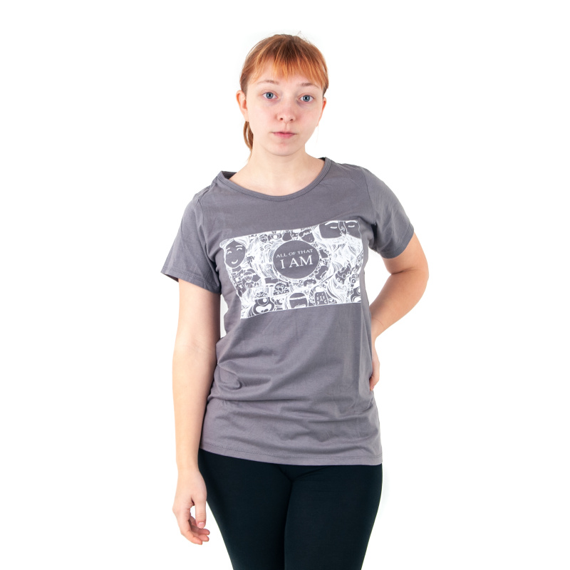 Women's T-shirt with print and positive mantra I AM ALL OF THAT in grey, size M