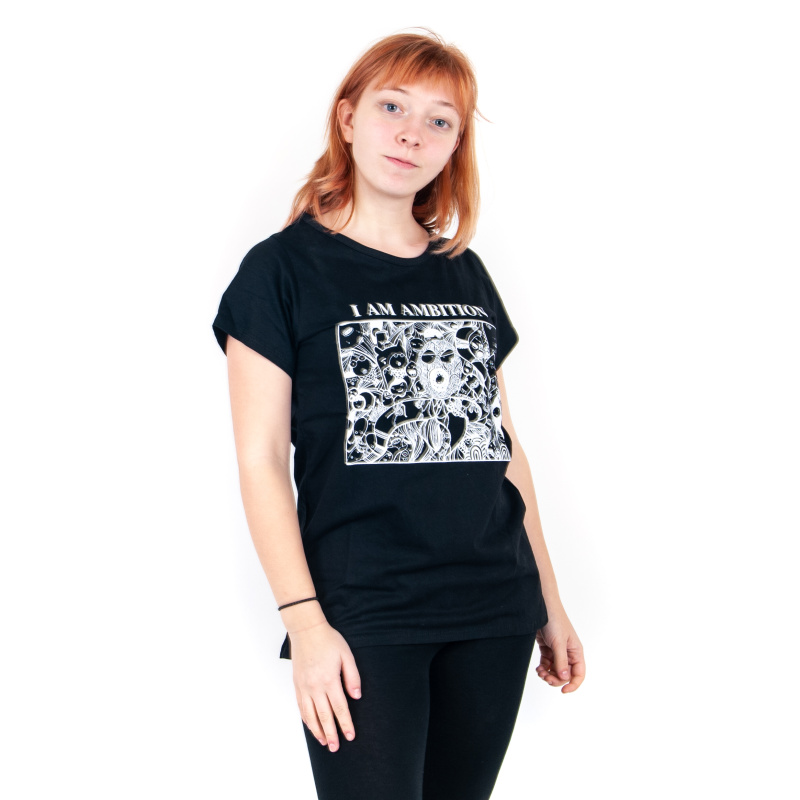 Women's T-shirt with print and positive mantra I AM AMBITION in black, size M