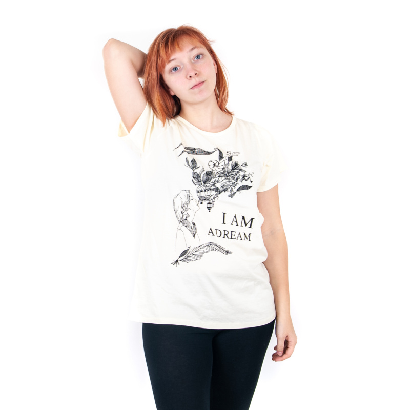 Women's T-shirt with print and positive mantra I AM A DREAM in beige, size M