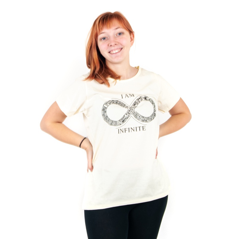 Women's T-shirt with print and positive mantra I AM INFINITE in beige, size L