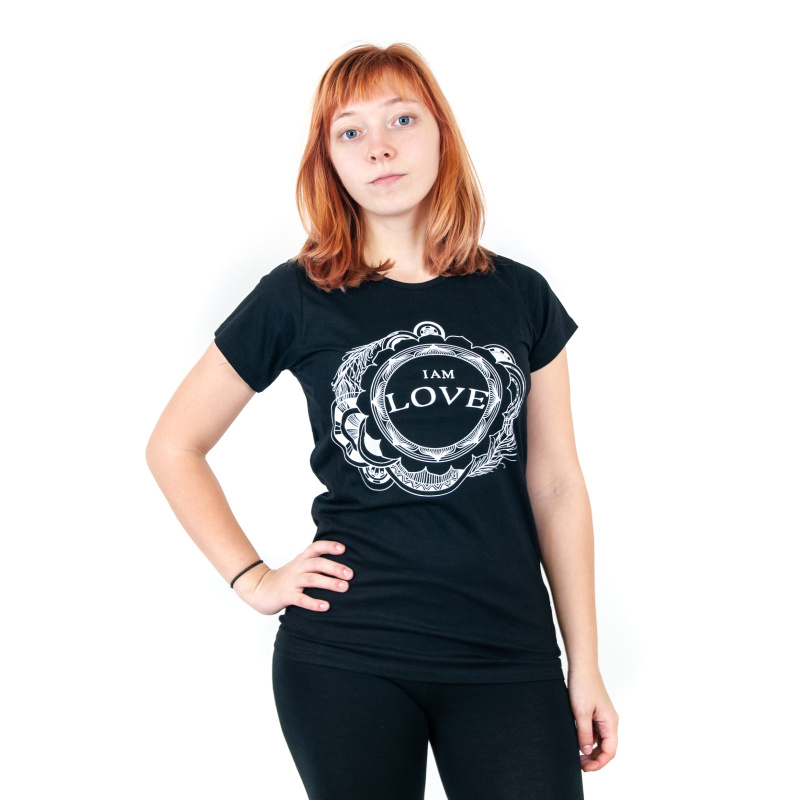 Women's T-shirt with print and positive mantra I AM LOVE in black, size M