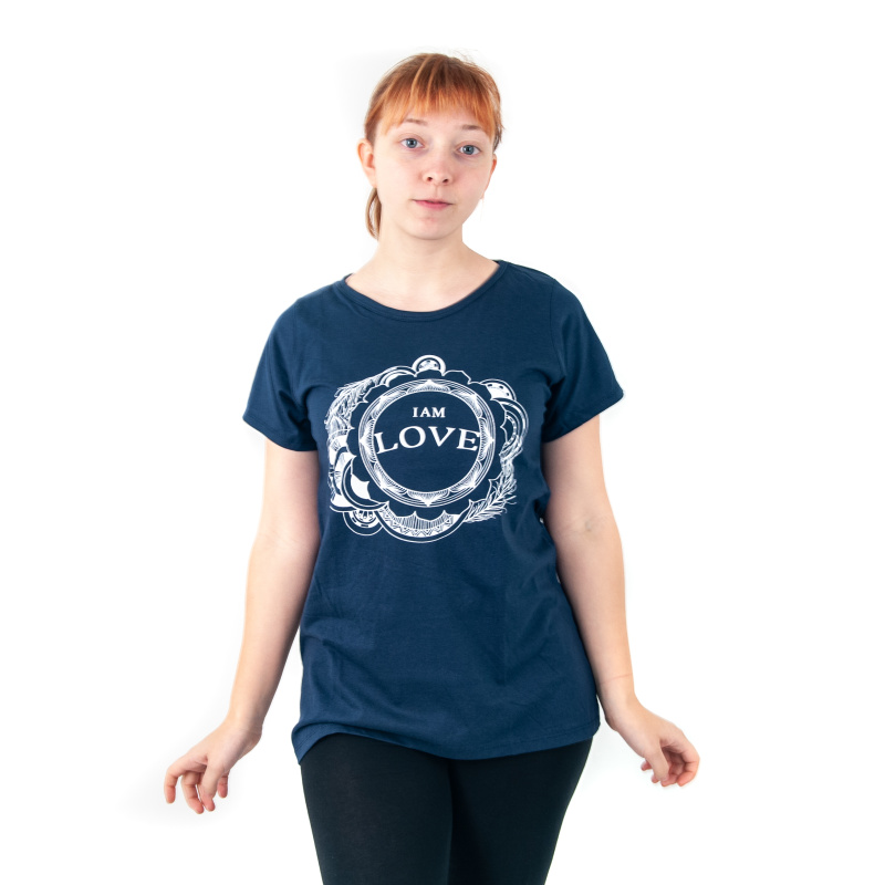 Women's T-shirt with print and positive mantra I AM LOVE in blue, size M