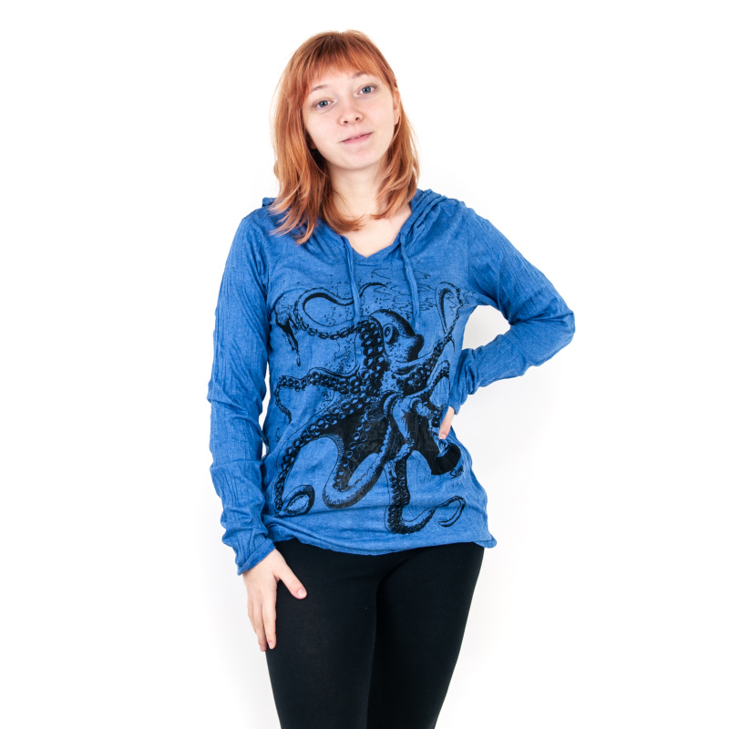 Women's long sleeve cotton T-shirt with SURE Octopus print in blue, size M