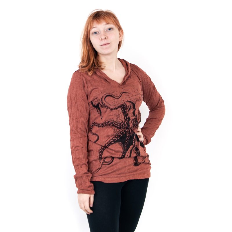 Women's long sleeve cotton T-shirt with SURE Octopus print in brown, size M