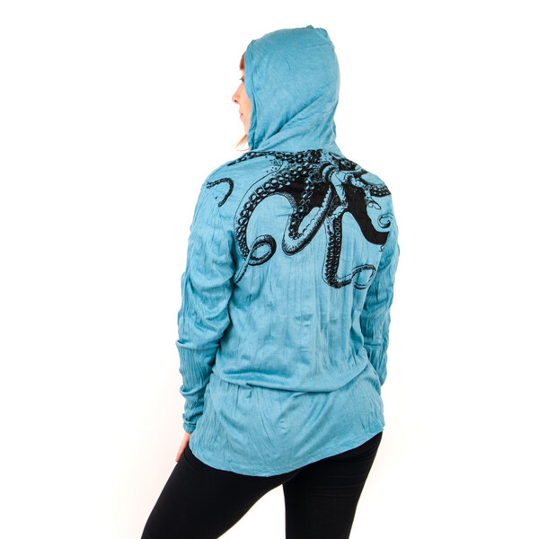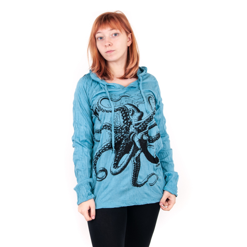 Women's long sleeve cotton T-shirt with SURE Octopus print in turquoise, size S