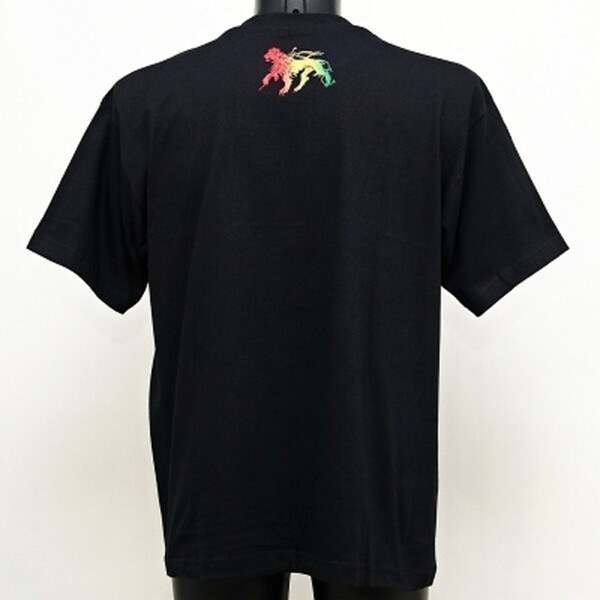 Black cotton T-shirt with a modern graphic of Bob Marley's head in rasta colours on the front and a lion on the back.