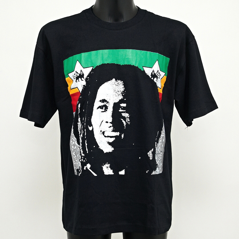 Comfortable black cotton T-shirt with Bob Marley's head on the front and a rasta-coloured lion on the back.