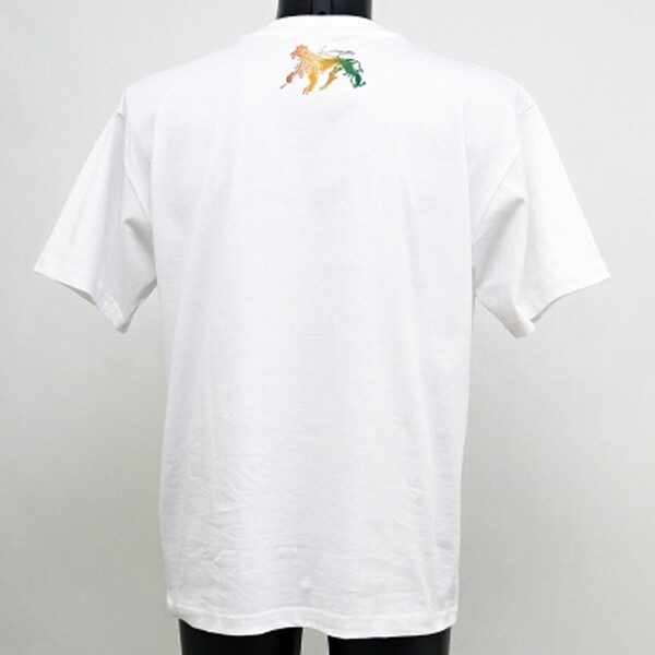 Comfortable white cotton T-shirt with Bob Marley's head on the front and a rasta-coloured lion on the back.