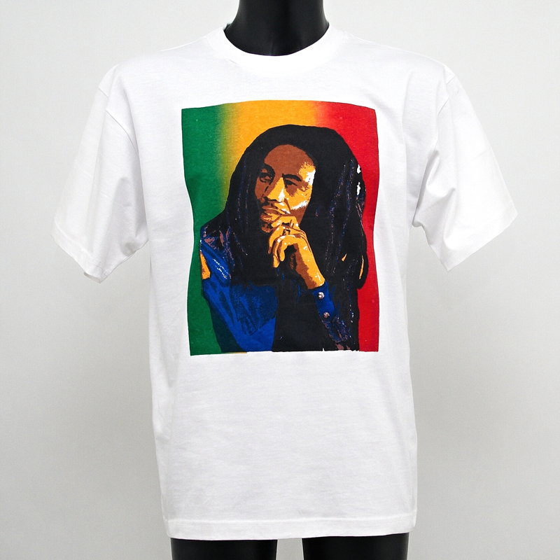 Comfortable white cotton T-shirt with Bob Marley's head on the front and a rasta-coloured lion on the back.