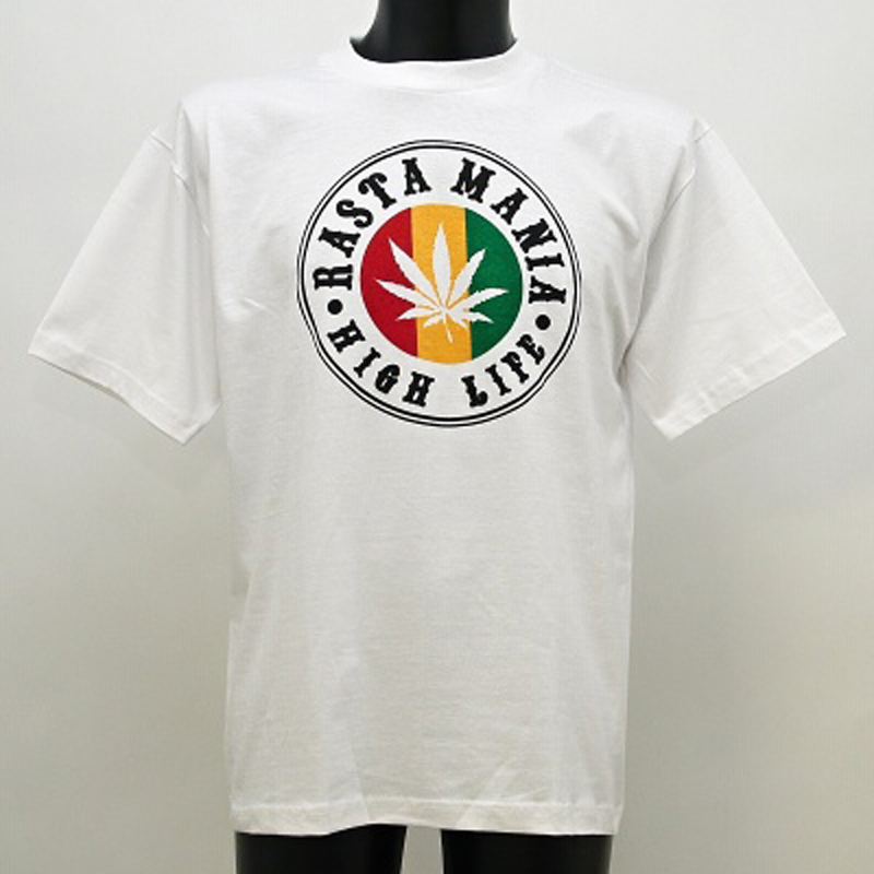 Comfortable cotton T-shirt with hemp leaf and RASTA MANIA HIGH LIFE on the front and green leaf on the back.
