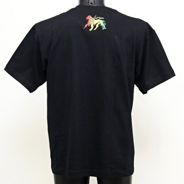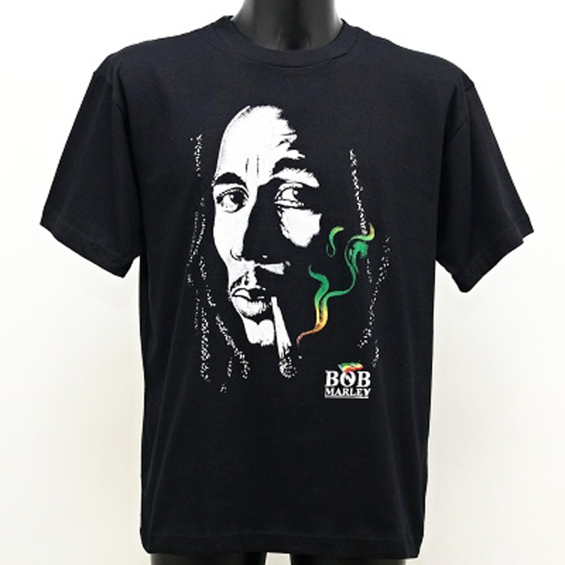 Comfortable black cotton T-shirt with smoking Bob Marley on the front and a lion on the back.