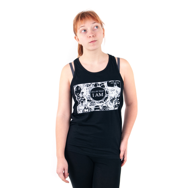 Women's tank top with print and positive mantra I AM ALL OF THAT in black, size M