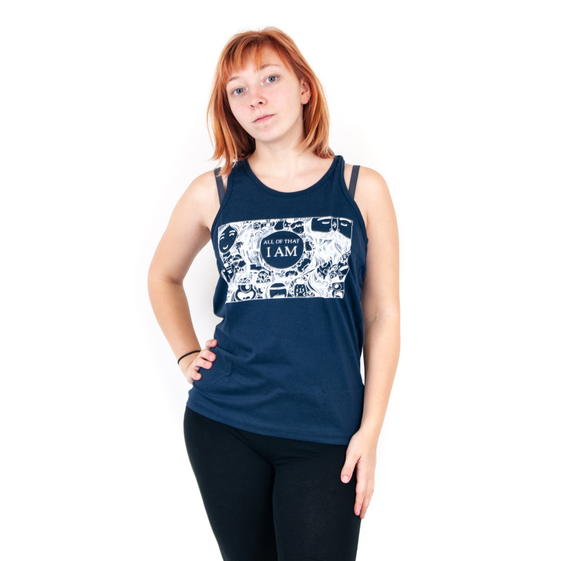 Women's tank top with print and positive mantra I AM ALL OF THAT in blue, size M