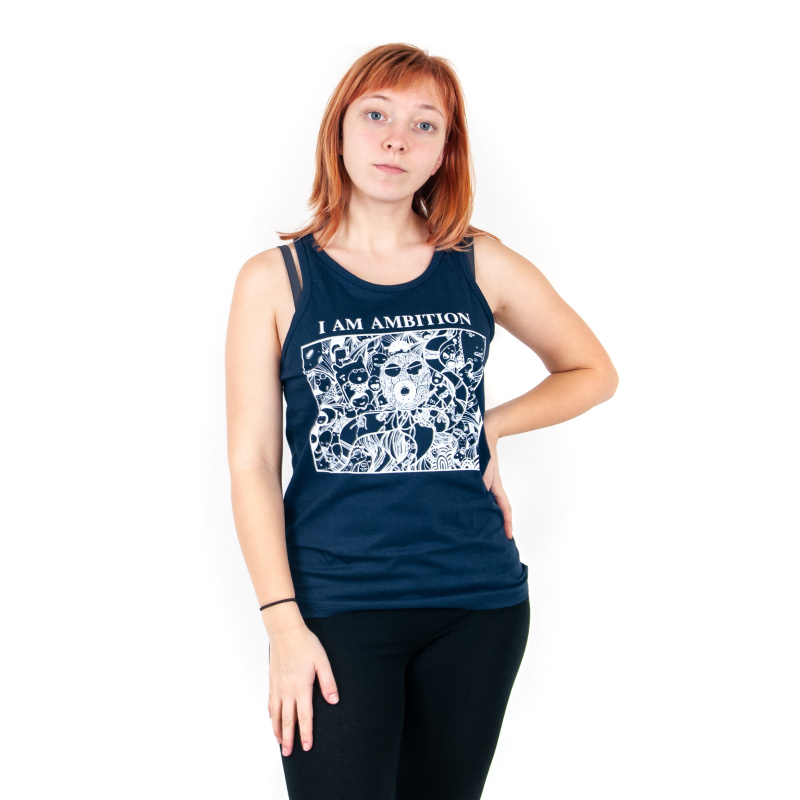 Women's tank top with print and positive mantra I AM AMBITION in blue, size L