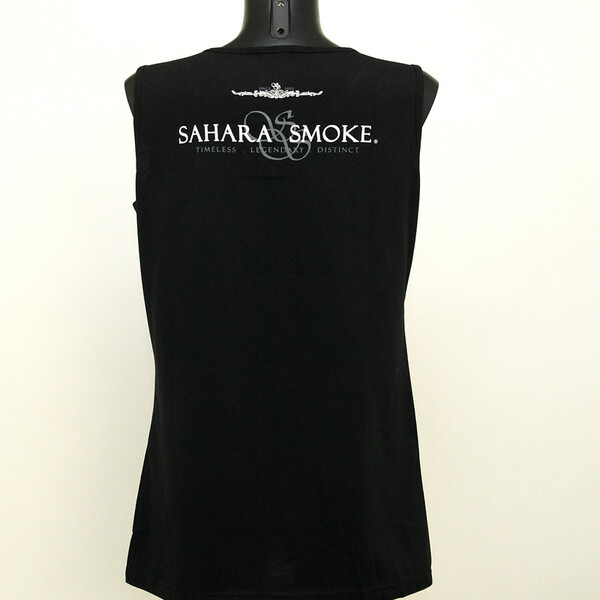 Women’s Tank Top made of cotton with inscription Do You Hookah on its front side and logo SAHARA SMOKE on the back side. Black color, size XL.