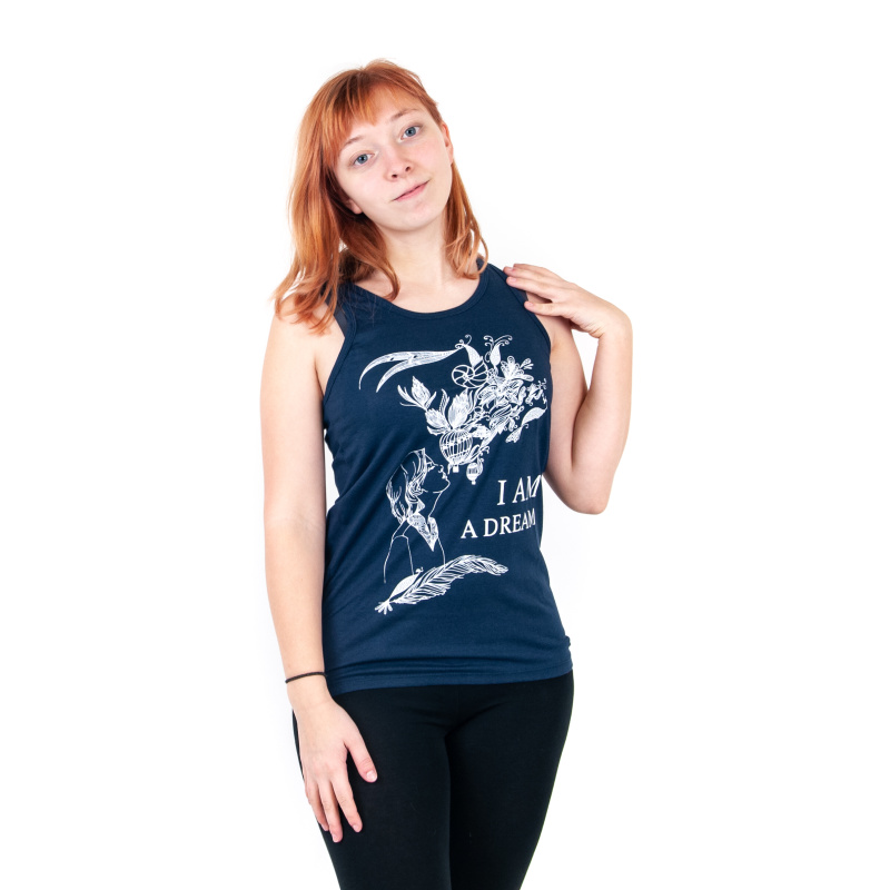 Women's tank top with print and positive mantra I AM A DREAM in blue, size M