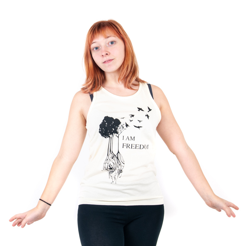Ladies tank top with print and positive mantra I AM FREEDOM in beige, size M