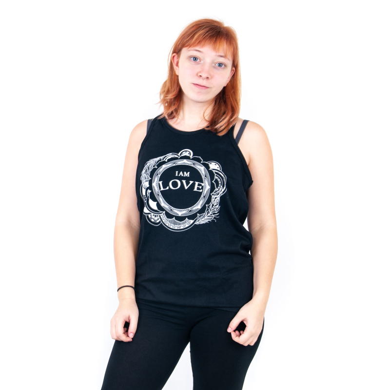 Women's tank top with print and positive mantra I AM LOVE in black, size L