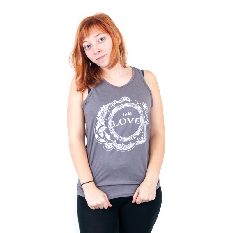 Women's tank top with print and positive mantra I AM LOVE in grey, size L