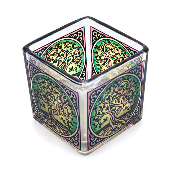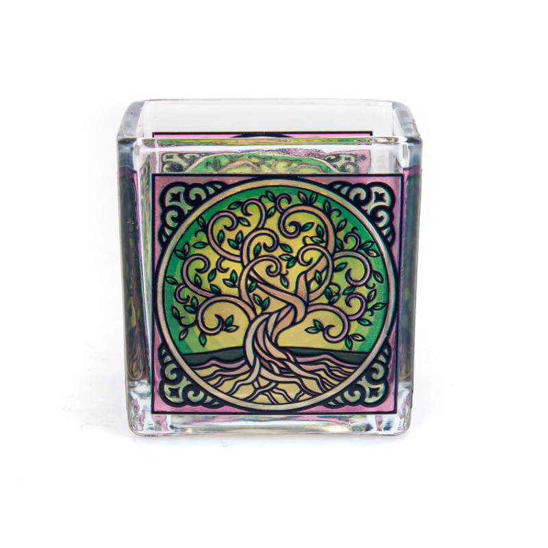 The glass candle holder with a Tree of Life motif is an elegant and decorative accessory designed for tealight candles.