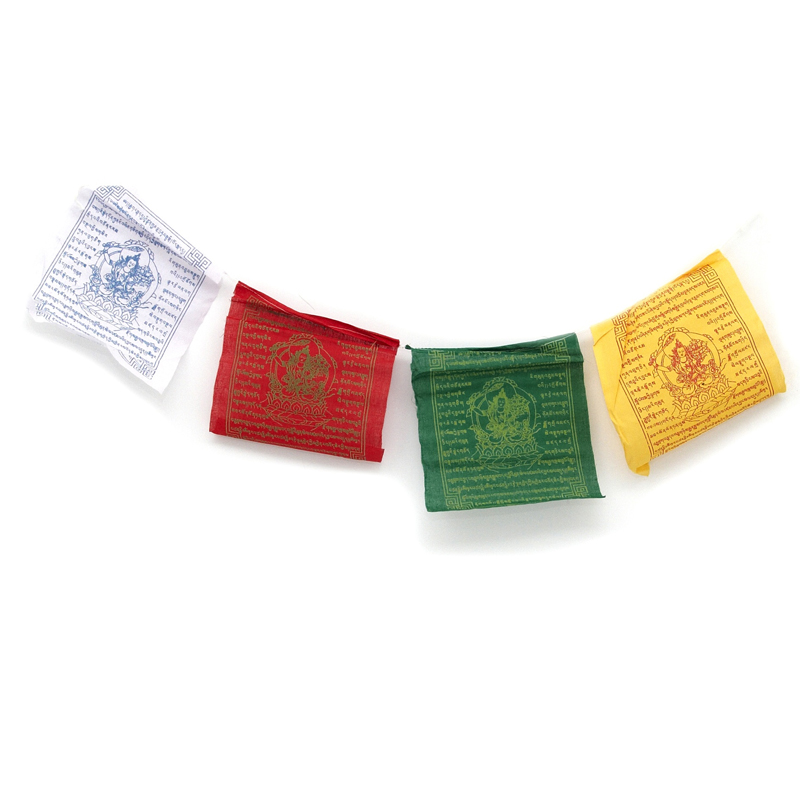 Tibetan prayer flags have 5 different colours representing the 5 elements of the earth. Red color - fire, green - wood, yellow - earth, blue - water, white - metal. Each flag carries the Buddha's teachings (mantras and sutras) and a representation of Manjushri. It is probably the oldest and most famous bodhisattva that dispels darkness.