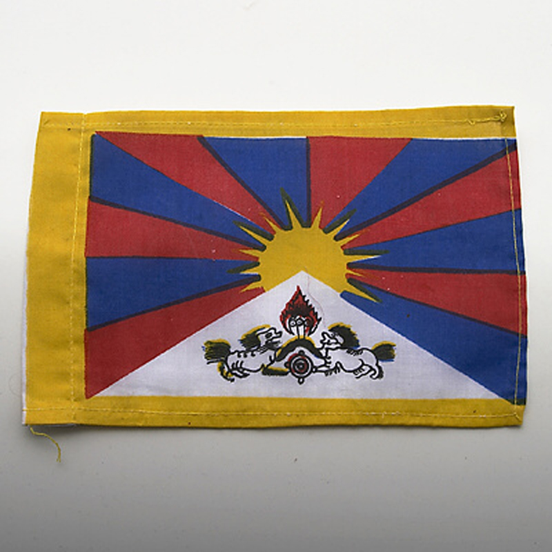 The border of the flag represents gold - as a symbol of the Buddha's teachings, and the side without the border represents openness to all non-Buddhist teachings. The red stripes represent the ancestors of the Tibetans (the original tribes), the snow-capped mountain in the middle symbolizes Tibet itself, with the Sun at its peak. The two snow lions carry a three-coloured gem representing the Buddha, the dharma (the right way that honours the laws of morality and the cosmic law of Love) and the sangha (the community of awakened disciples of the Buddha). At the feet of the lions lies a two-colored gemstone as a symbol of ethical conduct. The flag of Tibet was established as the official flag of Tibet in 1955, by the 14th Dalai Lama - Tenzin Gyatso. Since the 1959 anti-Chinese uprising, it has been banned in the PRC, except in Hong Kong.