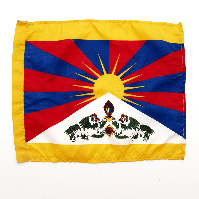 The border of the flag represents gold - as a symbol of the Buddha's teachings, and the side without the border represents openness to all non-Buddhist teachings. The red stripes represent the ancestors of the Tibetans (the original tribes), the snow-capped mountain in the middle symbolizes Tibet itself, with the Sun at its peak. The two snow lions carry a three-coloured gem representing the Buddha, the dharma (the right way that honours the laws of morality and the cosmic law of Love) and the sangha (the community of awakened disciples of the Buddha). At the feet of the lions lies a two-colored gemstone as a symbol of ethical conduct. The flag of Tibet was established as the official flag of Tibet in 1955, by the 14th Dalai Lama - Tenzin Gyatso. Since the 1959 anti-Chinese uprising, it has been banned in the PRC, except in Hong Kong.