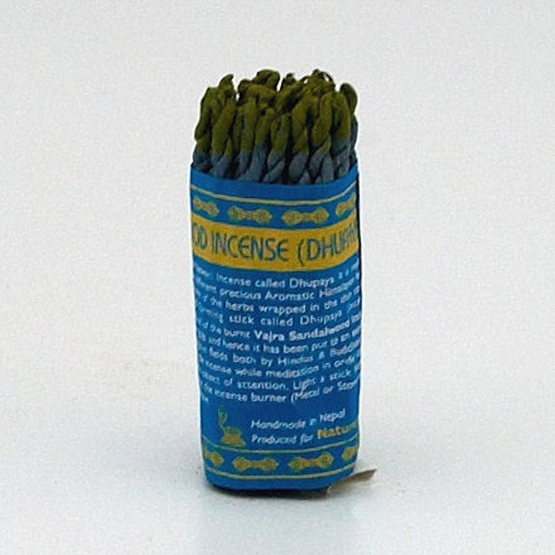 These are the traditional scented strings of Newar Nepalese called Dhupaya. Tibetan Dhupaya Vajra Sandalwood scented strings are made in the traditional way from various rare aromatic Himalayan herbs. The herbs are ground into a fine powder and wrapped in a thin strip of Lokta paper, which is rolled into strings called Dhupaya. The people of Nepal believe that the smoke emanating from the lit Vajra scented strings attracts the gods and therefore they have found wide use especially in religious ceremonies, both Hindu and Buddhist. Aspirants to the spiritual life light these scented strings during their meditations to keep the mind focused on the object of their interest. Light the string at the thicker end and place it on a scented string or stick holder (made of metal or stone). It contains no toxic or addictive substances.