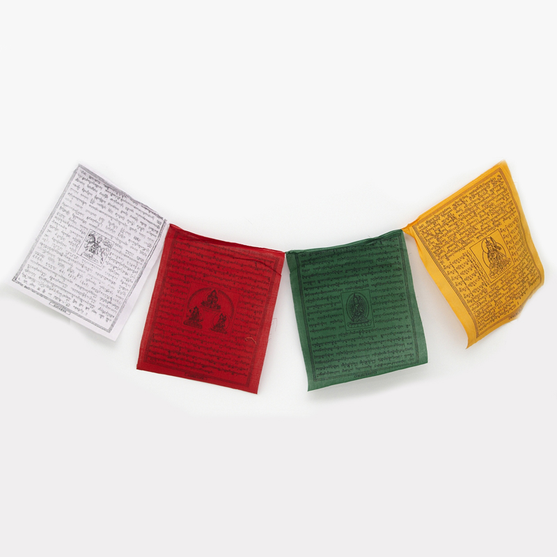 Tibetan prayer flags have 5 different colours representing the 5 elements of the earth. Red color - fire, green - wood, yellow - earth, blue - water, white - metal. Each flag carries the Buddha's teachings (mantras and sutras) and a representation of the LUNGTA. Lungta means "wind horse" and is the Tibetan symbol of good fortune, creative energy and well-being. Tibetans hang paper or cloth flags with the image of Lungta at important Buddhist sites, passes and especially on mountain tops. The wind carries the teachings from these flags around and into the minds of beings. Buddhists in Tibet believe that the wind constantly reads these mantras and carries them to the spirits in the mountains.