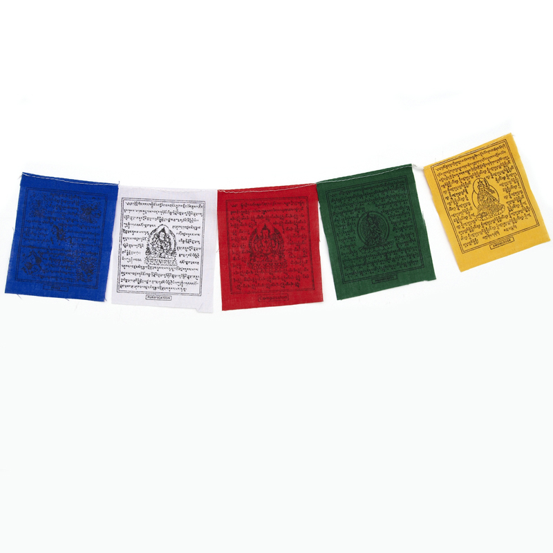 Tibetan prayer flags have 5 different colours representing the 5 elements of the earth. Red color - fire, green - wood, yellow - earth, blue - water, white - metal. Each flag carries the Buddha's teachings (mantras and sutras) and a representation of the five different mantras.